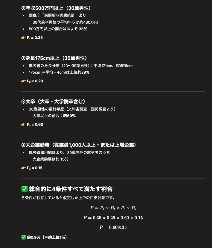 例えば30歳男性、年収500万円以上、身長175cm以上、大卒、大企業勤務を「普通」とした場合、上位何%になるのかチャッピーに計算してもらいました。
